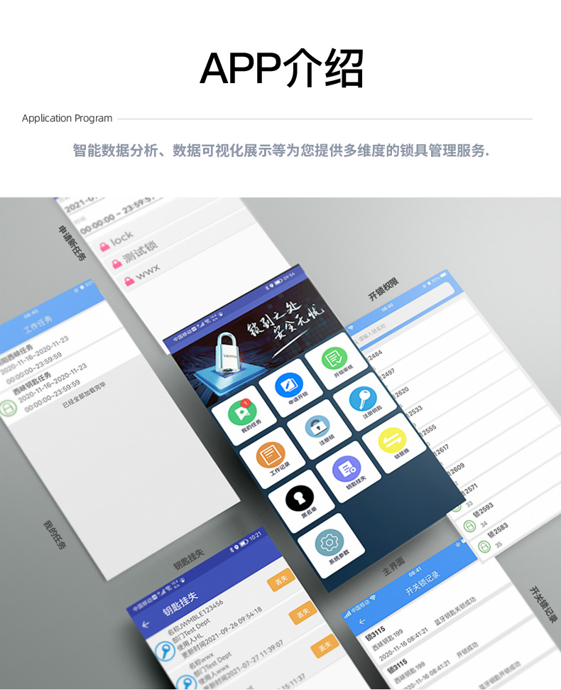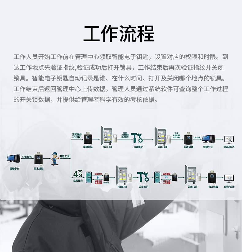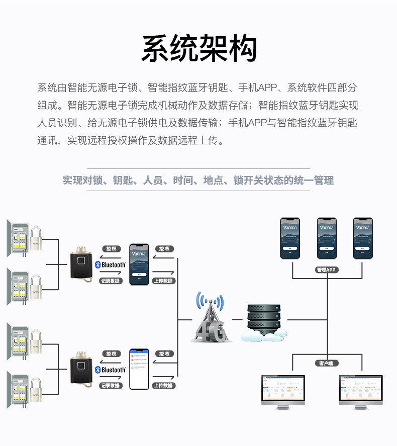 通過指紋先驗證開關鎖人員,再由手機APP遠程授權開關鎖權限,鑰匙自動記錄開關鎖數據,通過手機APP實現遠程數據上傳,系統軟件自動分析開關鎖數據。實現開關鎖數字化管理