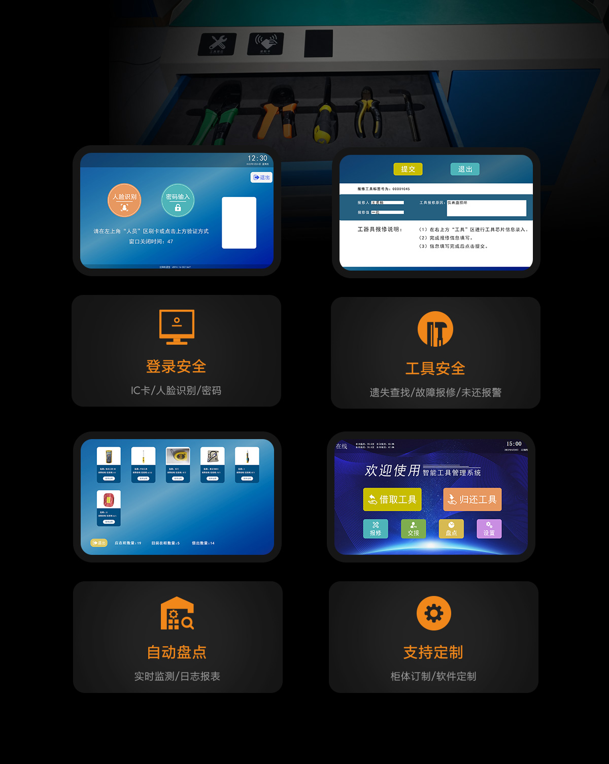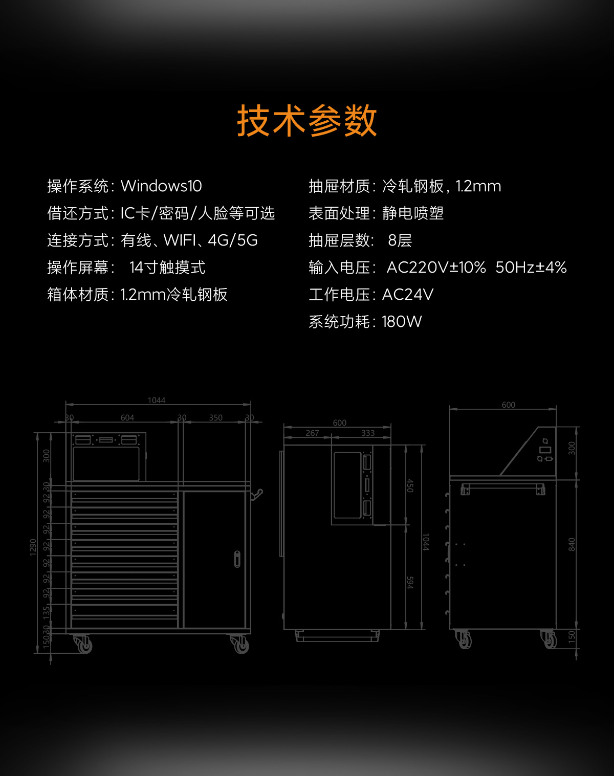 操作系統:Windows10 借還方式:IC卡/密碼/人臉等可選 連接方式:有線、WIFI、4G/5G 操作屏幕:14寸觸摸液晶屏 箱體材質:1.2mm冷軋鋼板 抽屜材質:冷軋鋼板,1.2mm 表面處理:靜電噴塑 箱體材質:1.5mm冷軋鋼板 表面處理:經典噴塑 抽屜層數: 8層 輸入電壓:AC220V±10% 50Hz±4% 工作電壓:AC24V 系統功率:180W