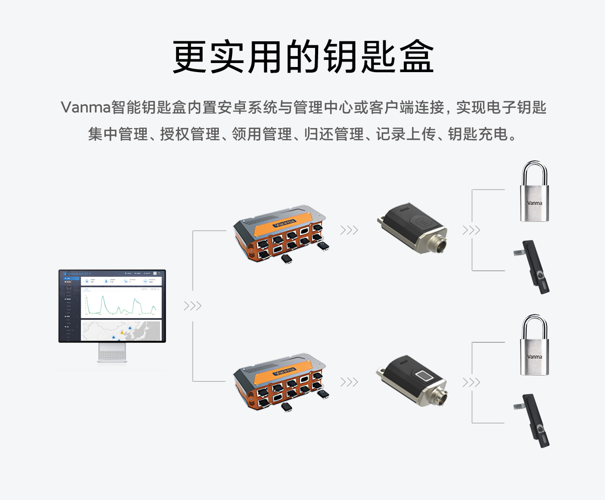 Vanma智能鑰匙盒內(nèi)置安卓系統(tǒng)與管理中心或客戶端鏈接,
