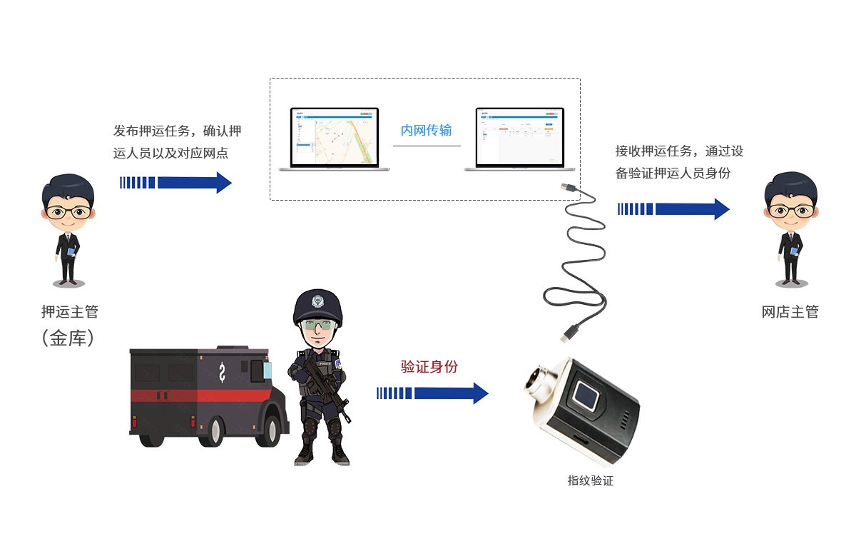 由押運公司主管(金庫主管)制定任務,指定相應押運人員以及對應網點編號。押運人員到網點后,由該網點主管登錄系統接收任務,并由相應押運人員進行身份驗證(在指紋電子鑰匙上),只有(指紋)驗證通過后,方可進行款箱交接。